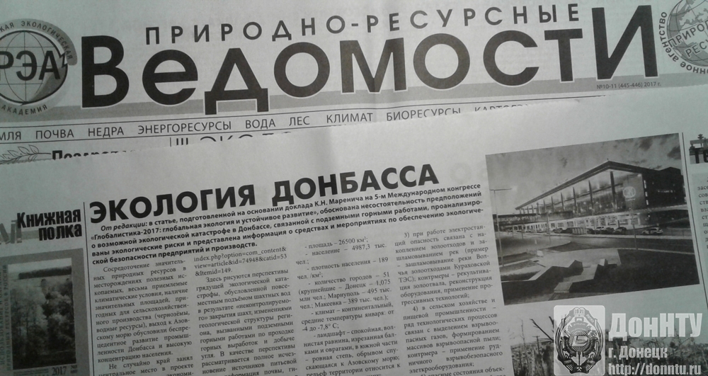 «Экология Донбасса» – так называется аналитическая статья ректора ДонНТУ, профессора , опубликованная в газете «Природно-ресурсные ведомости» Российской экологической академии (г. Москва) по материалам его выступления на «Глобалистика-2017: глобальная экология и устойчивое развитие».