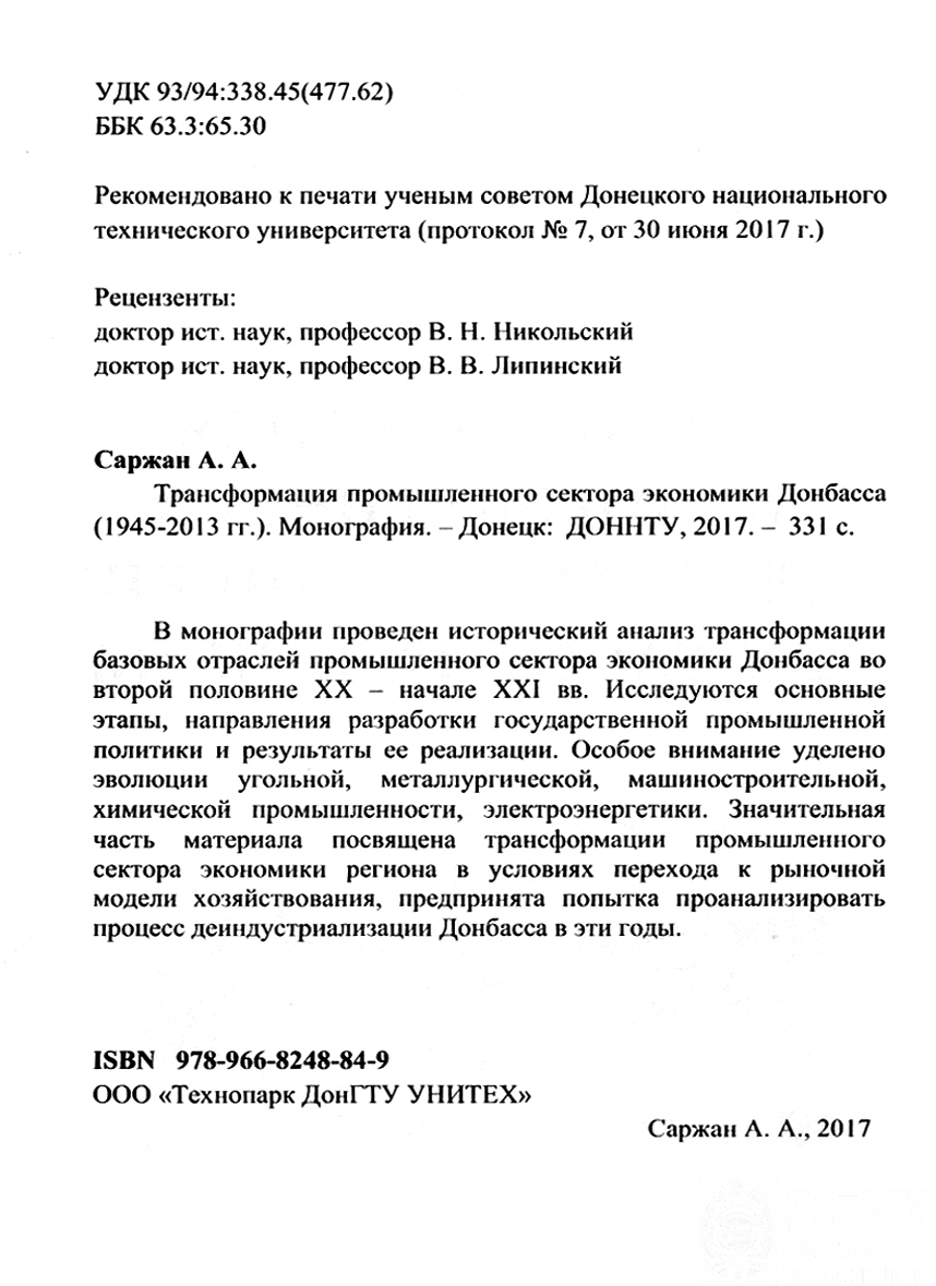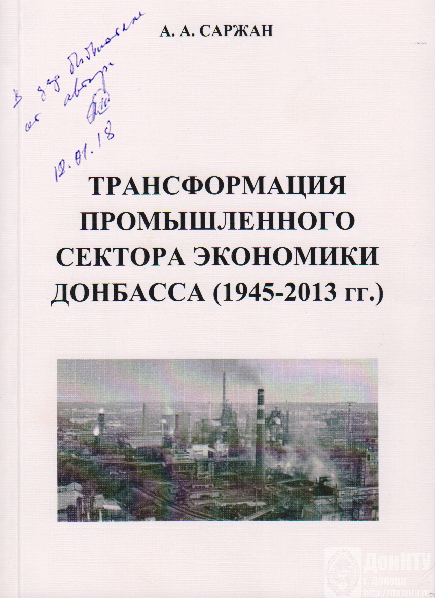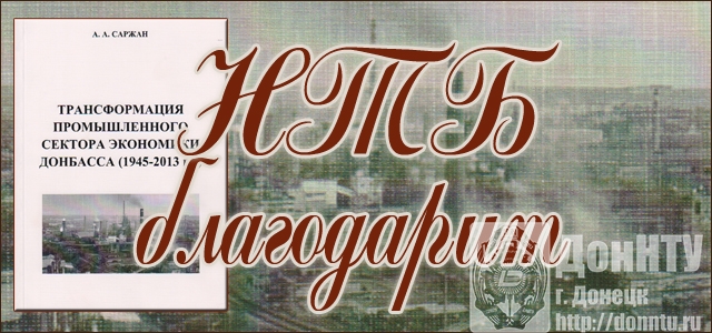 Указом Главы Донецкой Народной Республики 2018 год объявлен Годом истории Донбасса. «Мы должны помнить свои корни, свою историю и для нас эта тема очень актуальна», – подчеркнул во время пресс-конференции, проходившей 11 января, Александр Владимирович Захарченко. Своевременным откликом на этот призыв стал результат многолетнего труда доктора исторических наук, профессора, заведующего кафедрой истории и права ДонНТУ Анатолия Афанасьевича Саржана – монография «Трансформация промышленного сектора экономики Донбасса (1945-2013 гг.)», переданная автором в дар научно-технической библиотеке.