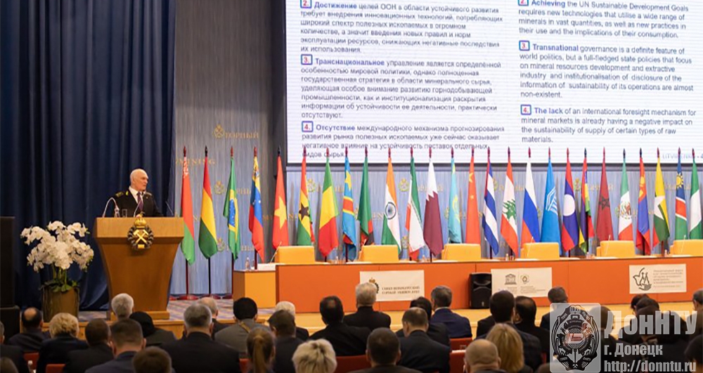 С установочным докладом «Минеральные ресурсы как природный капитал, имеющий планетарное значение для устойчивого развития общества» к делегатам обратился ректор Санкт-Петербургского горного университета, председатель Совета управляющих Международного центра компетенций в горнотехническом образовании под эгидой ЮНЕСКО В. С. Литвиненко.