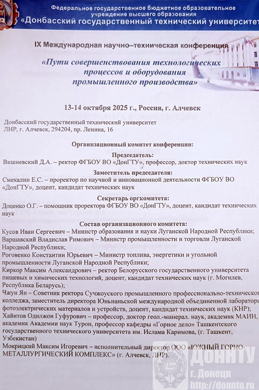 В Донбасском государственном техническом университете (Алчевск) 13-14 октября прошла IX Международная научно–техническая конференция «Пути совершенствования технологических процессов и оборудования промышленного производства», приуроченная к 68-летию со дня основания вуза.