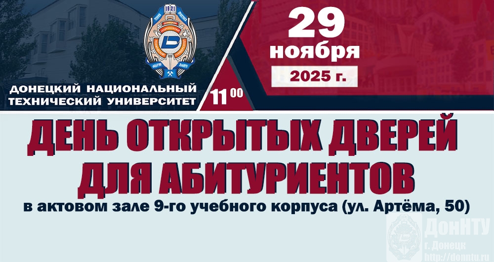 Уважаемые абитуриенты! В Донецком национальном техническом университете в связи с началом вступительной кампании и с целью проведения профориентационной работы с абитуриентами 29 ноября в 11:00 пройдет День открытых дверей в очном формате в актовом зале 9-го учебного корпуса (ул. Артёма, 50).