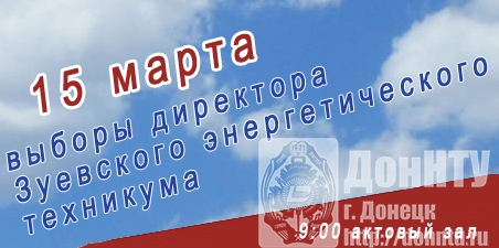 Зуевский энергетический техникум ГВУЗ «ДонНТУ» объявляет, что 15 марта 2016 года в 9:00 в актовом зале образовательного учреждения состоится общее собрание работников и студентов (делегатов) в соответствии с п. 3.1 «Временного порядка назначения директора образовательного учреждения среднего профессионального образования», утвержденного приказом Министерства образования и науки Донецкой Народной Республики от 30.10.2015 № 745.