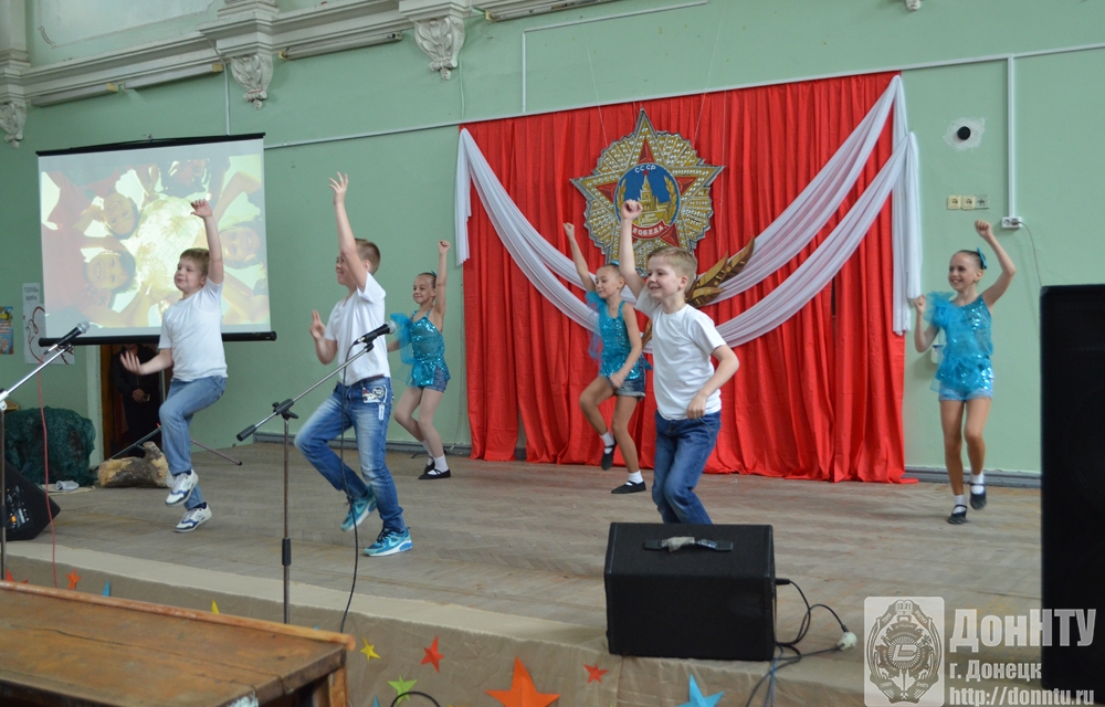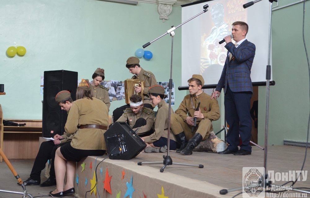 Также для ветеранов и сотрудников ДонНТУ в Большом наклонном зале 3-го учебного корпуса силами Студенческого центра культуры (директор Е. В. Базга) был организован праздничный концерт. Со сцены звучали стихи и фронтовые письма, песни о минувшей войне и призывы остановить нынешнюю, стремительные солдатские пляски сменялись трогательным вальсом. Поздравили ветеранов и совсем юные таланты – танцевальный коллектив «Пролисочек» и вокалистка Ж. Коваленко. Завершился праздничный концерт песней «День Победы», которую зрители прослушали стоя, наградив исполнителей овациями.