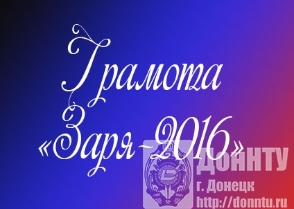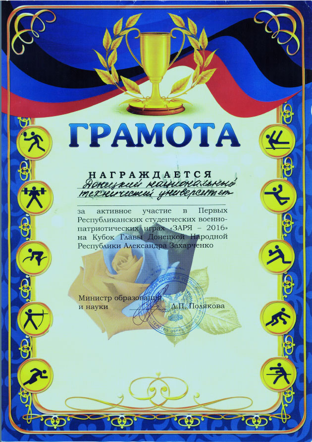 Донецкий национальный технический университет награжден грамотой за активное участие в Первых Республиканских студенческих военно-патриотических играх «ЗАРЯ-2016» на Кубок Главы Донецкой Народной Республики Александра Захарченко.