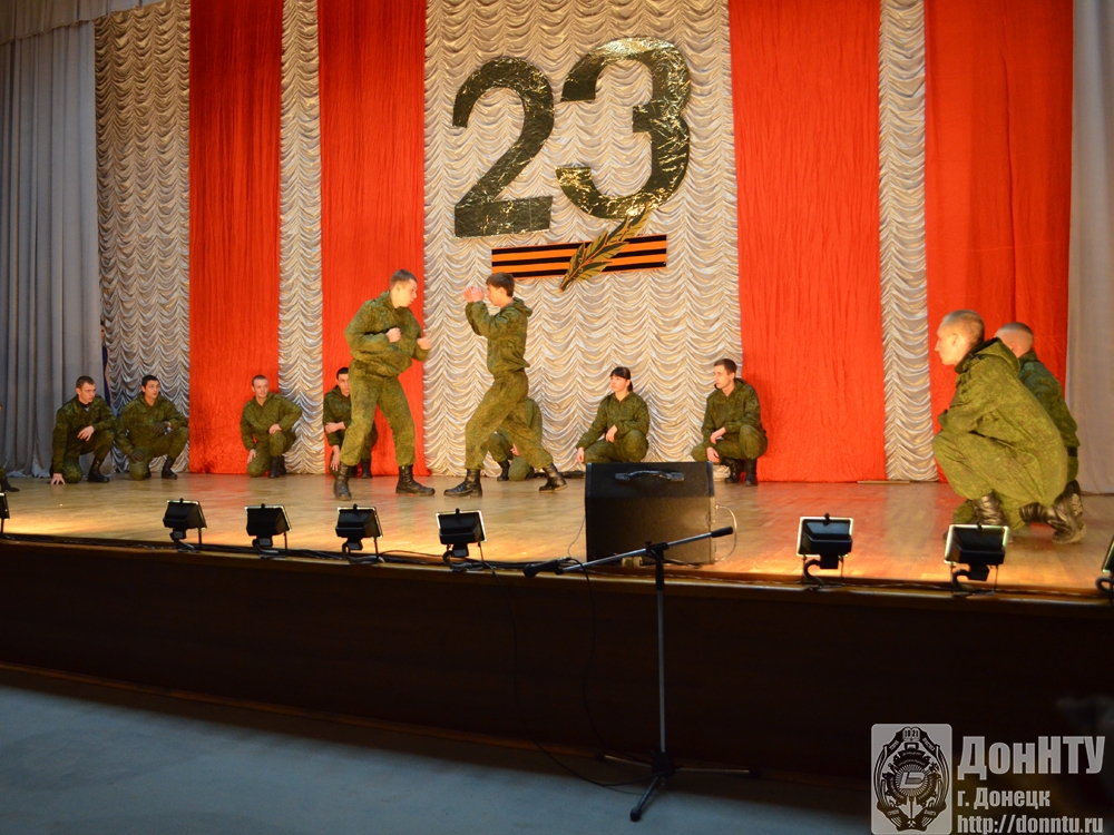 В канун Дня защитника Отечества, 21 февраля, в Студенческом центре культуры Донецкого национального технического университета прошел праздничный концерт, посвященный Дню защитника Отечества. Ведущие мероприятия и студентки Института гражданской защиты Донбасса (ИГЗД) ДонНТУ рассказали об истории этого праздника, прочитали стихи и поздравления, адресованные собравшимся в зале мужчинам.