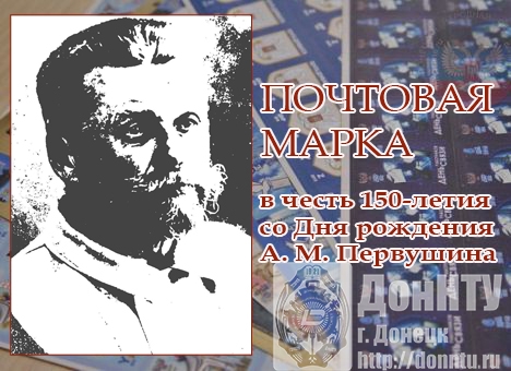 В обращение вводится марка, посвященная 150-летию со дня рождения профессора вуза Алексея Михайловича Первушина. В честь этого события 6 марта в 11:00 в холле 1-го учебного корпуса Донецкого национального технического университета (г. Донецк, ул. Артема, 58) состоится спецгашение новой почтовой марки специальным почтовым штемпелем первого дня.