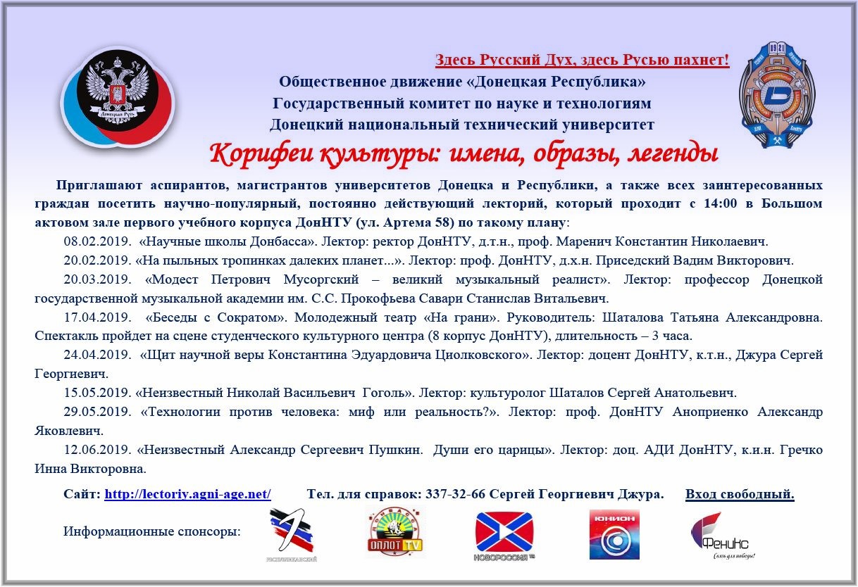 Общественное движение «Донецкая Республика», Государственный комитет по науке и технологиям, Донецкий национальный технический университет приглашают всех желающих посетить научно-популярный лекторий «Корифеи культуры: имена, образы, легенды», который пройдет в Большом актовом зале первого учебного корпуса ДонНТУ (ул. Артема, 58). Начало – 14:00.