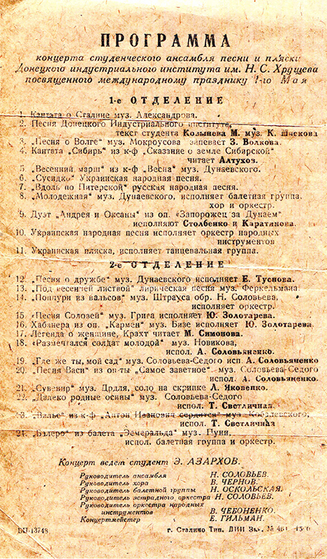 И вот недавно фонды музея истории ДонНТУ пополнились уникальным экспонатом – первой концертной программкой Анатолия Соловьяненко. Представитель династии донецких политехников Евгений Сергеев передал в дар музею раритетную «Программу концерта студенческого ансамбля песни и пляски Донецкого индустриального института, посвященного международному празднику 1 Мая». Эта программа бережно хранилась в семье одного из  видных ученых вуза Герца Гойхмана, д-ра техн.наук, профессора, заведующего кафедрой «Разработка месторождений полезных ископаемых». Концерт проходил в 1953 году, состоял из двух отделений.  Репертуар ансамбля просто потрясает – оперные партии, исполняемые студентами, сложные музыкальные произведения в исполнении оркестра, русские и украинские народные песни и даже «Болеро» из балета «Эсмеральда» Пуни. Анатолий Соловьяненко выступал во втором отделении, исполнив две популярные в те годы песни «Размечтался солдат молодой» и «Где же ты, мой сад», а также арии из оперетты «Самое заветное».