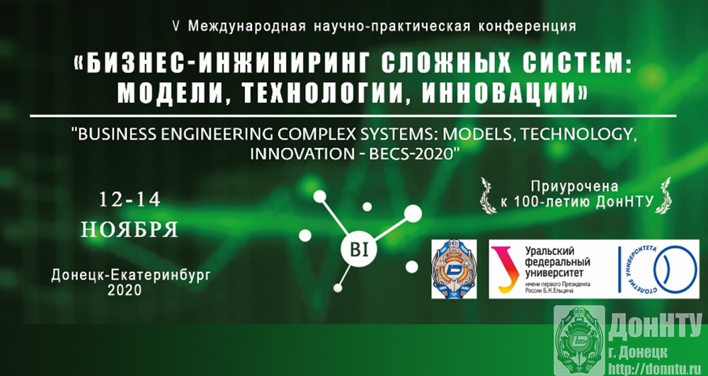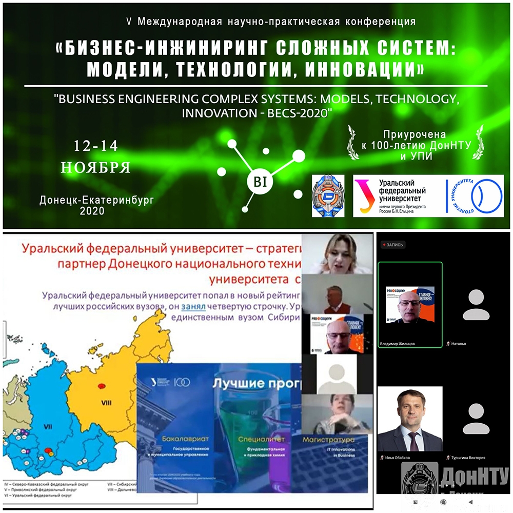 12–14 ноября прошла, в среде облачной платформы ZOOM, юбилейная V Международная научно-практическая конференция «Бизнес-инжиниринг сложных систем: модели, технологии, инновации BECS- 2020». Ее цель – привлечение ведущих специалистов в области цифровой экономики, интеграции в российское образовательное и научное пространство и обмен передовыми технологиями инжиниринга бизнес-систем и моделирования архитектуры предприятия. Учредители и организаторы конференции – кафедра экономической кибернетики факультета компьютерных наук и технологий ДонНТУ и базовая кафедра аналитики больших данных и методов видеоанализа Института радиоэлектроники и информационных технологий радиотехнического факультета (ИРИТ-РтФ) Уральского федерального университет им. первого Президента России Б. Н. Ельцина.