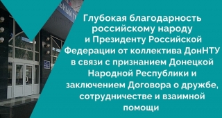 Глубокая благодарность российскому народу и Президенту Российской Федерации от коллектива ДонНТУ в связи с признанием Донецкой Народной Республики и заключением Договора о дружбе, сотрудничестве и взаимной помощи