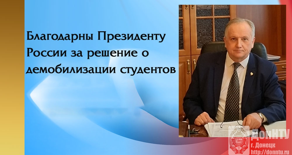 Весь наш коллектив, а также родители мобилизованных студентов глубоко признательны Президенту России за такое судьбоносное решение. Республика остро нуждается в высокопрофессиональных специалистах инженерных направлений для возрождения и развития промышленности Донбасса. Для решения задач Десятилетия науки и технологий потребуется труд многих тысяч талантливых инженеров — мотивированных, инициативных и хорошо подготовленных. И именно такими инженерами станет большинство наших студентов, которые в первые дни мобилизации встали на защиту Родины.
