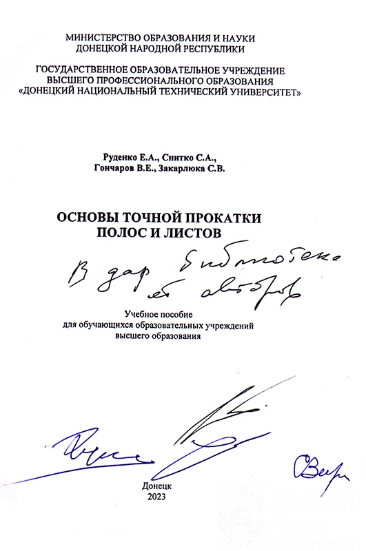Научно-техническая библиотека выражает глубокую признательность коллективу авторов кафедры обработки металлов давлением Е. А. Руденко, С. А. Снитко, В. Е. Гончарову, С. В. Закарлюке и А. В. Яковченко за переданные в дар: