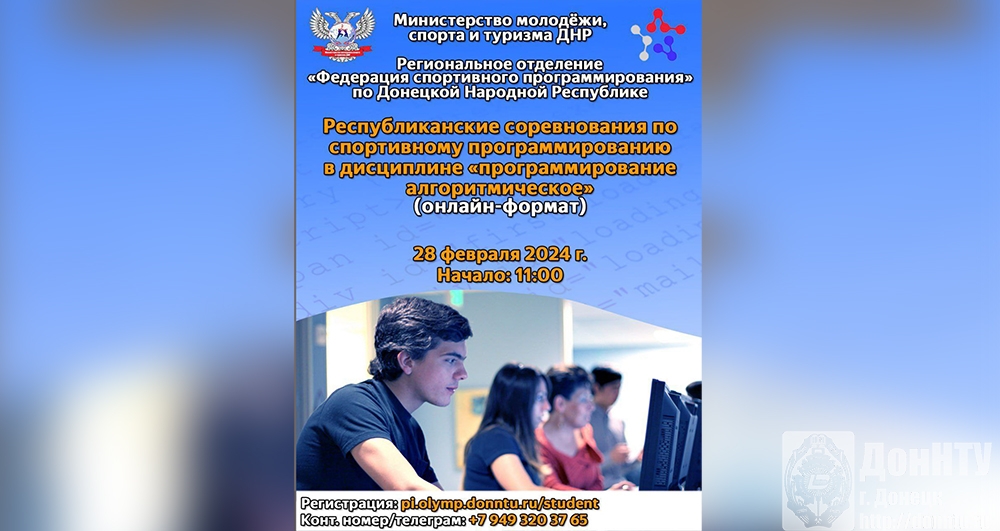 Донецкий национальный технический университет приглашает студентов вузов и аспирантов (в возрасте от 17 до 25 лет включительно) принять участие в Республиканских соревнованиях по спортивному программированию в дисциплине «Программирование алгоритмическое», которые будут проводитьсясовместно с Региональным отделением «Федерация спортивного программирования» по Донецкой Народной Республике в дистанционном формате 28 февраля в 13:00.