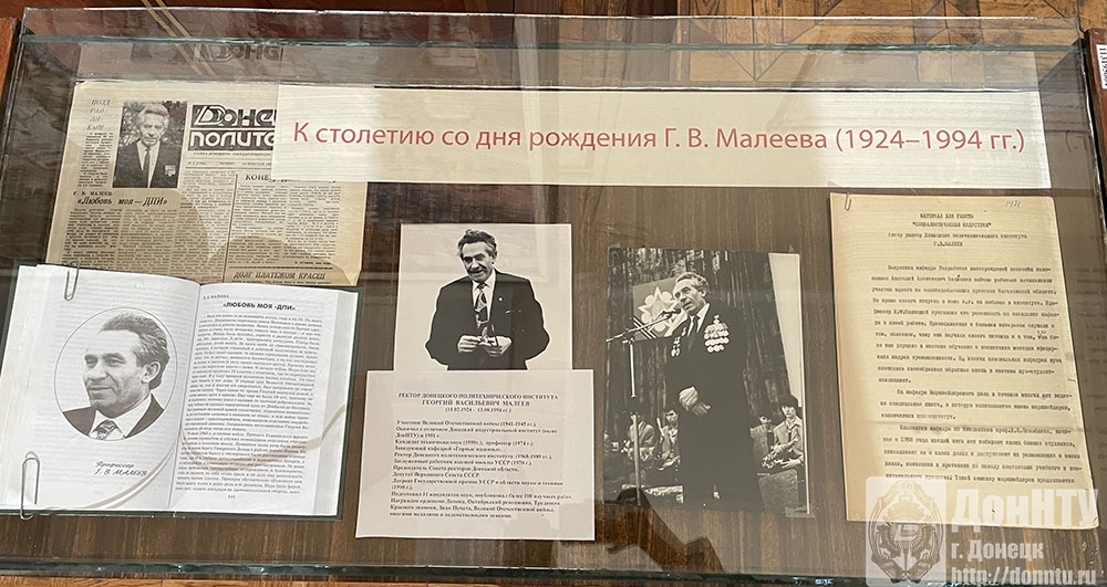 С биографией Георгия Васильевича присутствующих познакомила директор музея истории ДонНТУ Лидия Дмитриевна Ковалёва. Затем участники мероприятия были приглашены в музей на выставку артефактов жизни известного учёного и выдающегося руководителя Донецкого политехнического института. Лидия Дмитриевна обратила внимание аудитории на представленные фотографии, иллюстрирующие различные этапы жизни ректора Малеева, а также подчеркнула, что в годы его руководства вуз находился на пике развития.