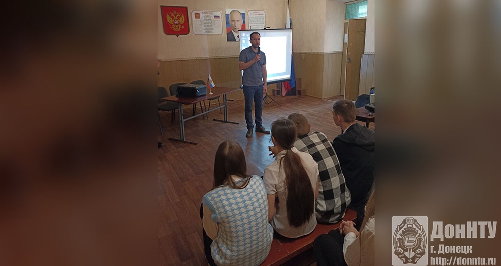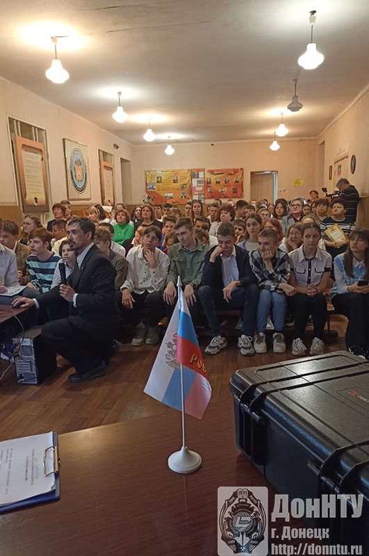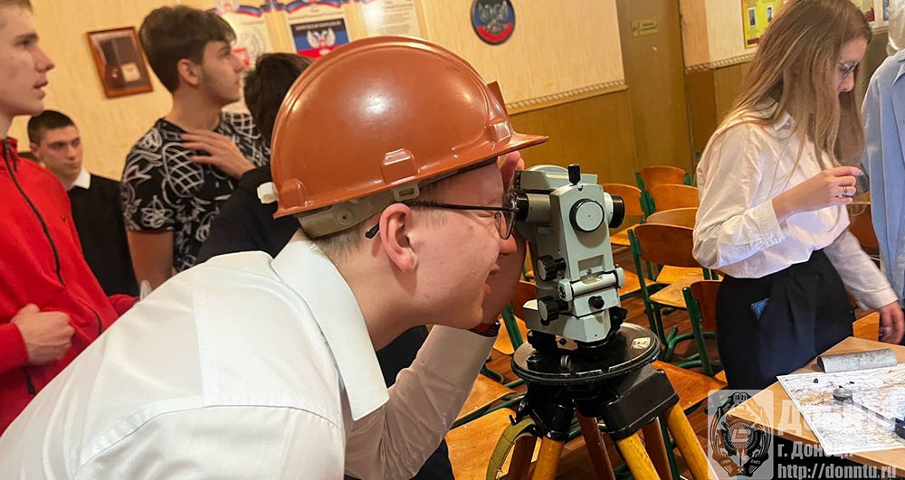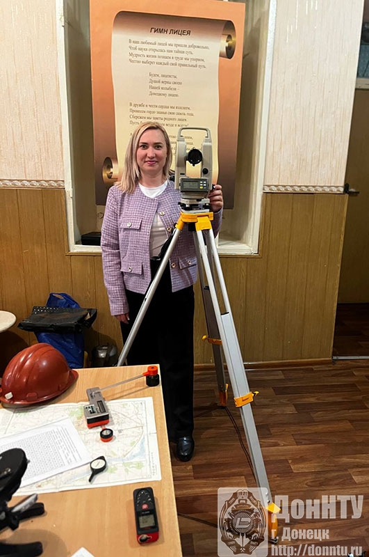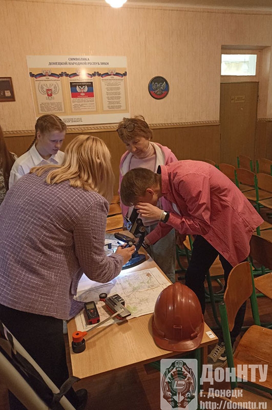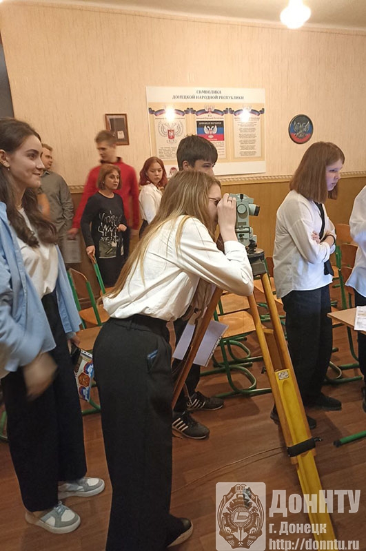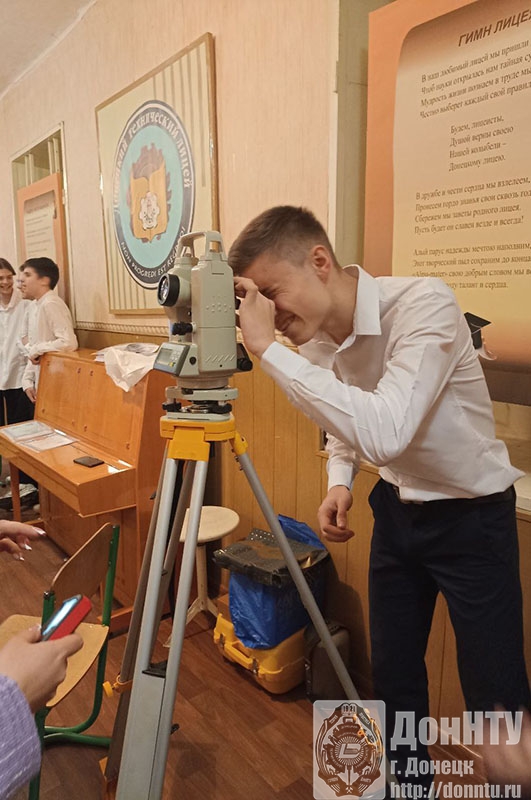 С приветственным словом выступил Алексей Борисович Бирюков. Ребятам были продемонстрированы ролики об истории ДонНТУ, его научных достижениях и международной деятельности. Павел Иванович Розкаряка и Андрей Владимирович Захаров познакомили ребят с роботами. Одного из них все ласково называли «Тузик». Павел Александрович Гнитиёв продемонстрировал школьникам современный тепловизор. А Алина Витальевна Тонофа пригласила ребят пополнить ряды МК РГО «Донбасс». Лицеисты также познакомились с оптическим и электронным теодолитами, механическим и электронным планиметрами, электронной рулеткой, курвиметром и микроскопом.