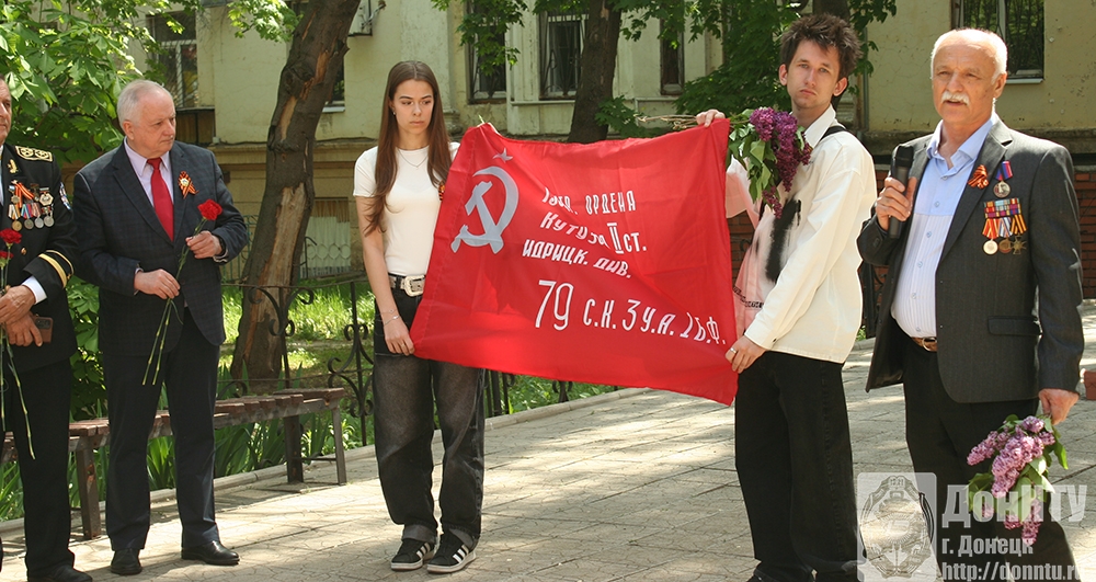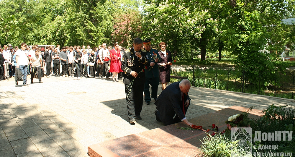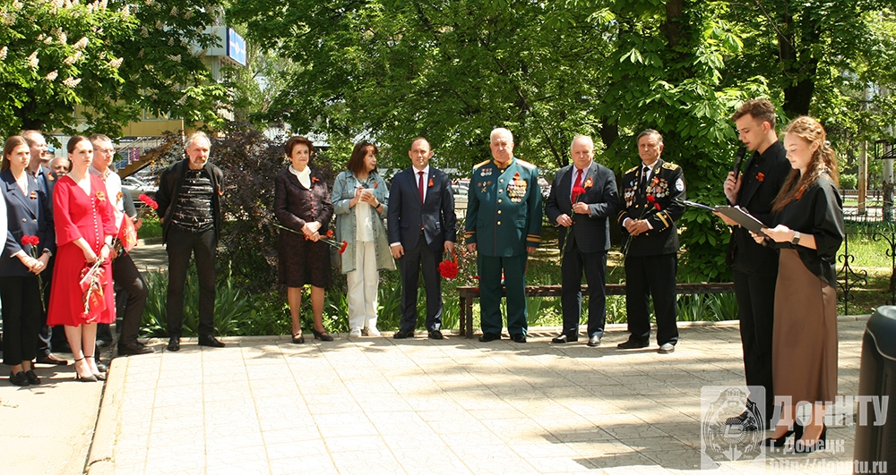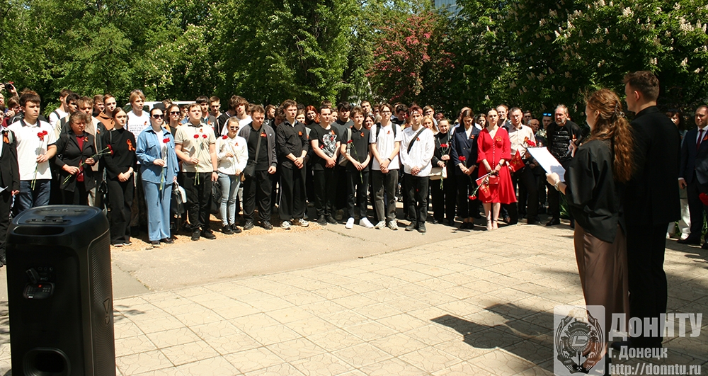 В Донецком национальном техническом университете 7 мая на территории 3 учебного корпуса возле памятника преподавателям, студентам и сотрудникам Донецкого политехнического института, павшим в Великой Отечественной войне 1941–1945 гг., состоялся торжественный митинг, посвящённый 80-летию Великой Победы. Организаторы – Студенческий молодёжный центр (директор – Елена Вениаминовна Багза) и профком работников ДонНТУ (председатель – Людмила Александровна Лазебная). Перед началом мероприятия звучали песни военных лет, а открыла его всем известная композиция «День Победы». В митинге приняли участие ректор Александр Яковлевич Аноприенко, проректоры Андрей Николаевич Рязанов, Андрей Эдуардович Федоров и Сергей Васильевич Борщевский, председатель профкома работников вуза Людмила Александровна Лазебная, председатель Совета ветеранов ДонНТУ Владимир Владимирович Паслён, директор музея истории Лидия Дмитриевна Ковалёва, председатели профкома и совета обучающихся Ольга Владимировна Карук и Диана Вадимовна Панасенко, деканы и преподаватели факультетов, сотрудники и студенты. Почётный гость – военный историк Александр Валентинович Глушко, сын выдающегося советского инженера и учёного в области ракетно-космической техники, основоположника советского жидкостного ракетного двигателестроения.