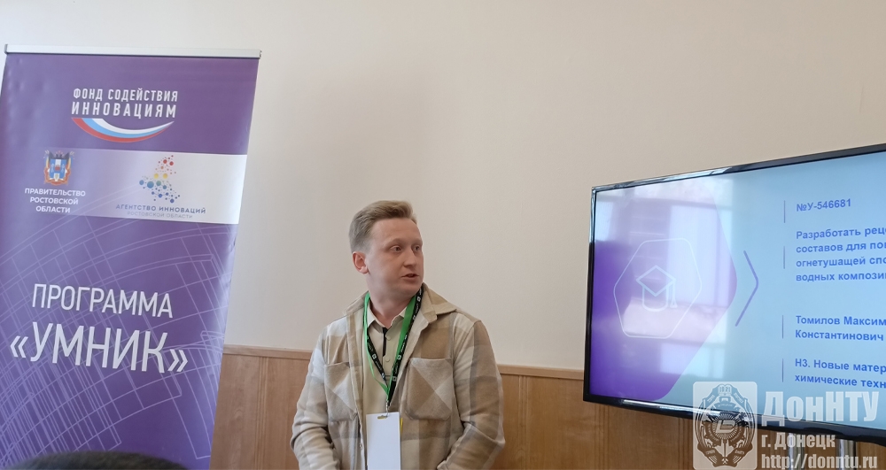Параллельно на третьей площадке проходил конкурс «УМНИК» от Фонда содействия инновациям. Свой проект на этой площадке успешно защитил перед экспертами аспирант ДонНТУ М. Томилов. Всего в этом году благодаря активности начальника отдела ПКРС Е. В. Алексеевой, а также консультациям ростовских коллег из АНО «Цифропрактика» на конкурс ФСИ «УМНИК» Донецкий политех представил 50% всех заявок от новых регионов РФ.