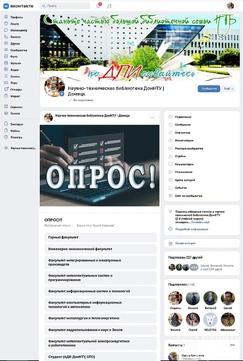 С нашей информацией можно ознакомиться на центральном сайте ДонНТУ, сайте библиотеки, а также в группах НТБ в социальных сетях, что позволяет нашим читателям быть более вовлечёнными в жизнь университета. Стремясь идти в ногу со временем и применяя новые технологии, научно-техническая библиотека стала центром притяжения для всех, а не только для тех, кто учится и работает в ДонНТУ.