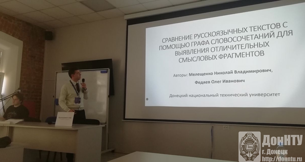 На секциях по машинному обучению и нейроинформатике, а также по интеллектуальному анализу текстов выступили Ирина Александровна Коломойцева («Автоматическое построение тезауруса: оценка методов кластеризации и векторного представления слов») и Николай Владимирович Мелещенко («Сравнение русскоязычных текстов с помощью графа словосочетаний для выявления отличительных смысловых фрагментов»). Результаты обоих докладов получены в рамках работы молодёжной научной лаборатории «Искусственный интеллект» ДонНТУ.