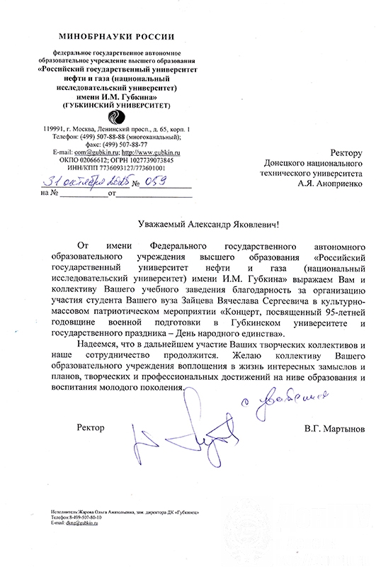 Ректор Губкинского университета В. Г. Мартынов выразил искреннюю благодарность за участие донецких политехников в праздничных мероприятиях,проводимых в РГУ нефти и газа (НИУ) имени И. М. Губкина, прислав благодарственное письмо на имя ректора ДонНТУ А. Я. Аноприенко. В нём он выразил надежду на дальнейшее плодотворное сотрудничество вузов и пожелания коллективу Донецкого национального технического университета воплощения в жизнь интересных замыслов и планов, творческих и профессиональных достижений на ниве образования и воспитания молодого поколения.