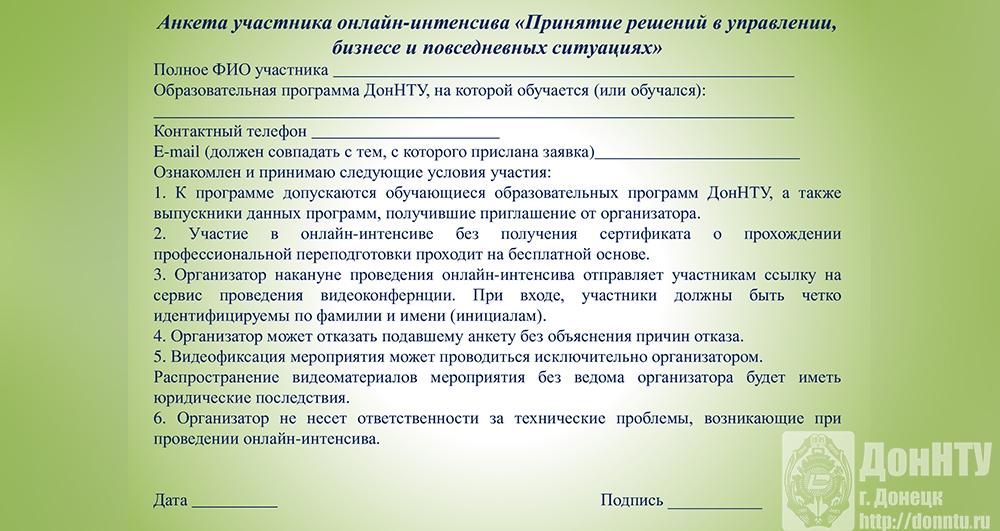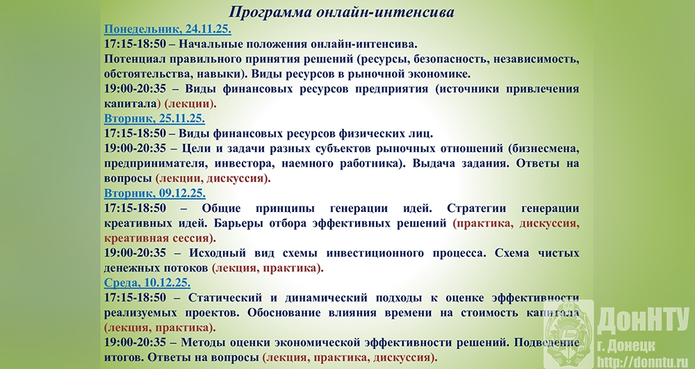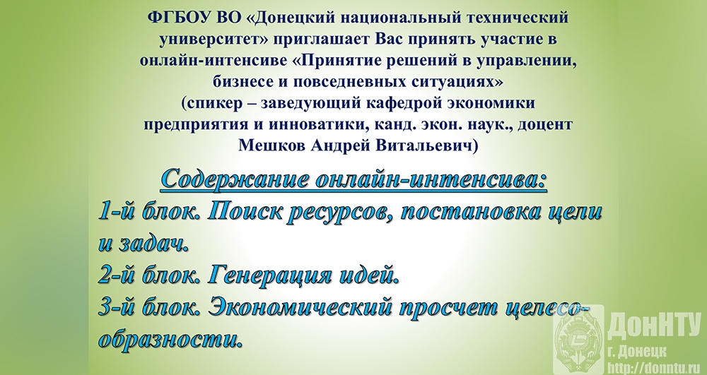 В рамках организации мероприятий по повышению финансовой грамотности и эффективности управления личными финансами, формированию у студентов профессиональных экономико-управленческих компетенций ДонНТУ проводит онлайн-интенсив «Принятие решений в управлении, бизнесе и повседневных ситуациях».