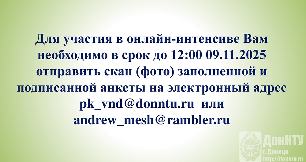 Сроки подачи анкеты участника – до 9 ноября до 12:00 (сканкопия (фотокопия) на почту или andrew_mesh@rambler.ru ). В случае прохождения программы в формате повышения квалификации – до 15 ноября.