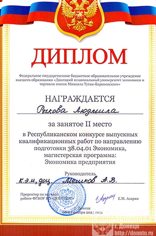 Выпускники кафедры экономики предприятия и инноватики приняли участие в Республиканском конкурсе выпускных работ по образовательным программам бакалавриата и магистратуры по направлениям подготовки 38.03.01 и 38.04.01 «Экономика» (профиль/магистерская программа «Экономика предприятия»), который состоялся 6–7 ноября на базе кафедры экономики предприятия и управления персоналом ДонНУЭТ им. М. Туган-Барановского.
