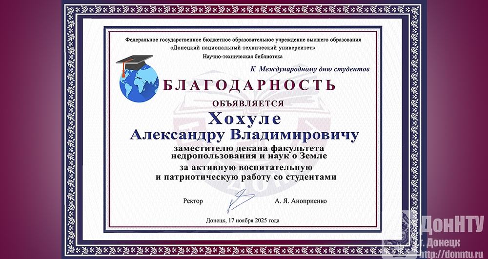 ФННЗ был награждён сертификатом участника, а декан факультета Ирина Викторовна Филатова и её заместитель Александр Владимирович Хохуля были удостоены благодарности ректора ДонНТУ