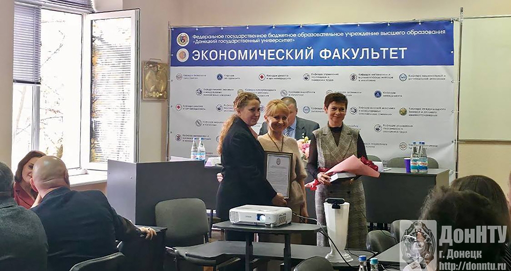 Елена Николаевна Вишневская и Яна Владимировна Хоменко поздравили коллег и вручили заведующей кафедрой национальной и региональной экономики ДонГУ Елене Георгиевне Кошелевой поздравительное письмо, подписанное ректором ДонНТУ Александром Яковлевичем Аноприенко. Он высоко оценил активную позицию кафедры в восстановлении и развитии системы образования и научной школы в ДНР и подчеркнул важность партнёрских отношений между двумя вузами, которые позволят сформировать новую конкурентоспособную модель образовательного процесса в Российской Федерации.