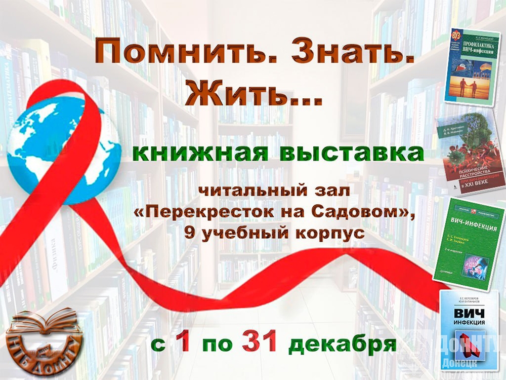 – к Международному дню борьбы со СПИДом ознакомиться с книжной выставкой «Помнить. Знать. Жить…» (читальный зал «Перекресток на Садовом», 9 учебный корпус, 1–31 декабря);