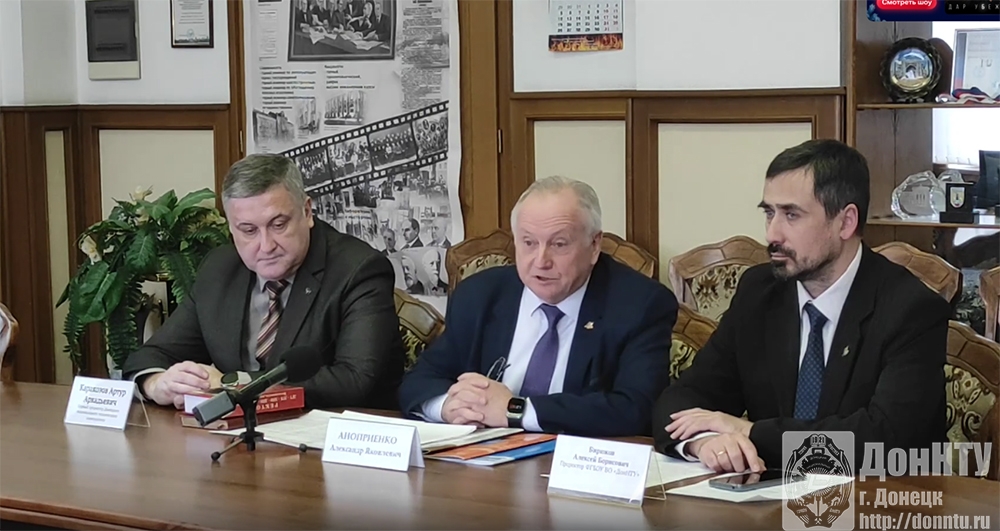 А. Я. Аноприенко, первого проректора А. А. Каракозова и проректора А. Б. Бирюкова. Руководители вуза познакомили с историей и становлением ДонНТУ, который в следующем году отметит 105-летний юбилей. Они рассказали о наградах, достижениях и событиях, оказавших влияние на развитие университета, о важных партнёрских связях с другими учебными заведениями РФ и производственными предприятиями, о победах студентов на различных конкурсах, в том числе на получение стипендий Президента и Правительства России. Были также затронуты вопросы энергоперевооружения Донбасса в условиях войны, военной подготовки в вузе, прохождения студентами производственных практик на предприятиях региона и России, дальнейшей профориентационной работы в школах и многие другие.