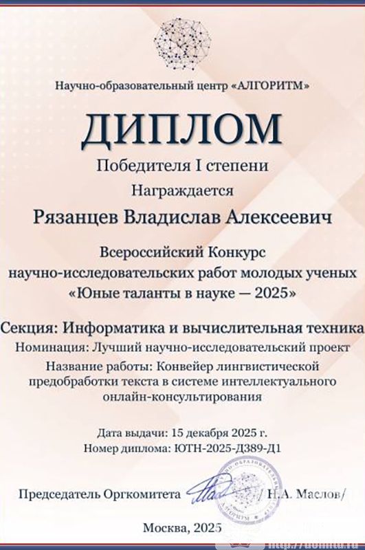 Студент кафедры программной инженерии имени Л. П. Фельдмана факультета интеллектуальных систем и программирования ДонНТУ Владислав Рязанцев (гр. ПИ-24в) получил диплом победителя I степени на Всероссийском конкурсе научно-исследовательских работ молодых учёных «Юные таланты в науке-2025» в номинации «Лучший научно-исследовательский проект».