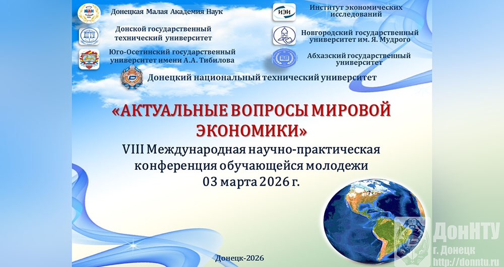 Донецкого национального технического университета совместно с Донецкой Малой Академией Наук, Институтом экономических исследований, Новгородским государственным университетом имени Ярослава Мудрого, Донским государственным техническим университетом, Абхазским государственным университетом и Юго-Осетинским государственным университетом имени А. А. Тибилова 3 марта проведут VIII Международную научно-практическую конференцию обучающейся молодёжи «Актуальные вопросы мировой экономики».