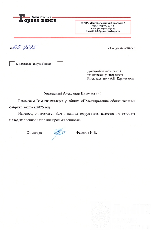 Декан горного факультета Александр Николаевич Корчевский передал в научно-техническую библиотеку вуза учебник «Проектирование обогатительных фабрик» (10 экз.), полученный от его автора Константина Вадимовича Федотова. В нём изложены требования к проекту обогатительной фабрики, последовательность операций при проектировании производственного цикла переработки твердых полезных ископаемых. Приведены сравнительные методы расчёта качественно-количественных схем, а также схемы рудоподготовки и измельчения, классификации и обезвоживания, принципы выбора типа аппаратов для каждой операции. Даны примеры по размещению оборудования в цехах и отделениях, представлены основные параметры и компоновка зданий, транспортные схемы рудного потока и продуктов сепарации. Рассмотрен комплекс вопросов, определяющих экономику горно-обогатительного производства.