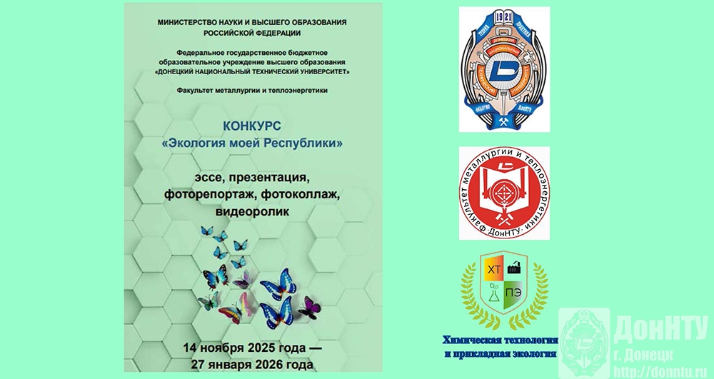 С 14 ноября 2025 года по 27 января 2026 года кафедра химической технологии и прикладной экологии факультета металлургии и теплоэнергетики Донецкого национального технического университета проводила масштабный конкурс среди школьников – «Экология моей Республики». Главной целью мероприятия стало привлечение внимания подрастающего поколения к вопросам охраны окружающей среды, формирование экологической культуры и любви к родному краю.