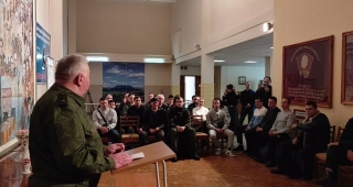Проректор, генерал-лейтенант А. Э. Федоров, имеющий большой боевой опыт Чеченской войны, познакомил аудиторию с историей создания праздника. Когда в январе 1918 года после Октябрьской революции к власти пришли большевики, Совет народных комиссаров советской России опубликовал Декрет о создании новых вооружённых сил – рабоче-крестьянской Красной армии. После этого в прифронтовых городах начали формироваться первые красноармейские роты из добровольцев. 23 февраля под Псковом и Нарвой Красная армия одержала первые победы над немецкими войсками. С этого дня и началась история праздника. Также Андрей Эдуардович подчеркнул, что защита Отечества – главная функция государства и святая обязанность всех его граждан.