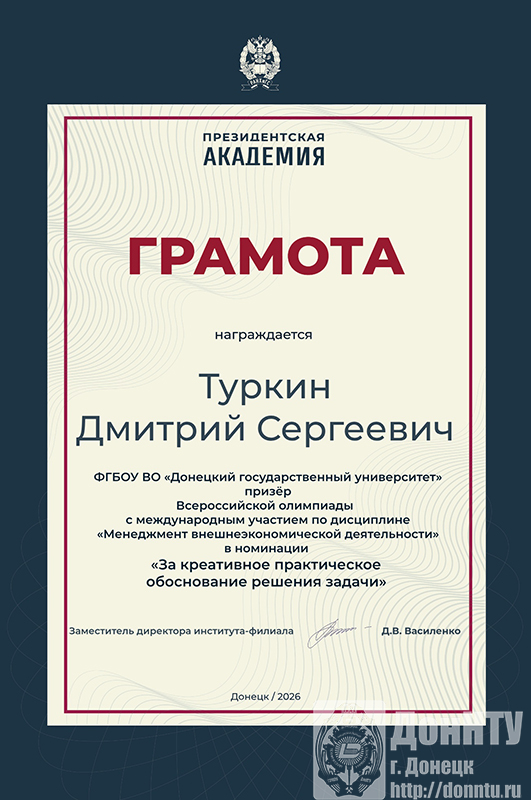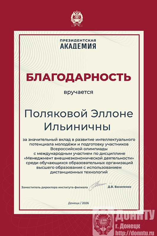 Эллона Ильинична Полякова, доцент кафедры, провела подготовку студентов к олимпиаде и её методический подход, ориентированный на развитие аналитических способностей и стратегического мышления, что позволило им уверенно справиться с заданиями разной степени сложности и показать достойные результаты. Проведение таких мероприятий способствует профессиональному росту студентов и укрепляет их интерес к выбранной специальности. В олимпиаде приняли участие студенты групп: ВЭД-22 – Анастасия Крылова, Алексей Забудский, Анастасия Епанешникова, Назар Крапивкин, Дмитрий Туркин; ИАС-23 – Максим Новиков, Николай Прожирко, Владимир Перфилов, Артем Арцызов, Артур Сиренко; ЭТЭК-23 – Кристина Брюханова, Никита Рябец; МПР-22 – Татьяна Горовенко, которая заняла II призовое место. Грамотой за креативное практическое обоснование решения задачи был награждён Дмитрий Туркин.
