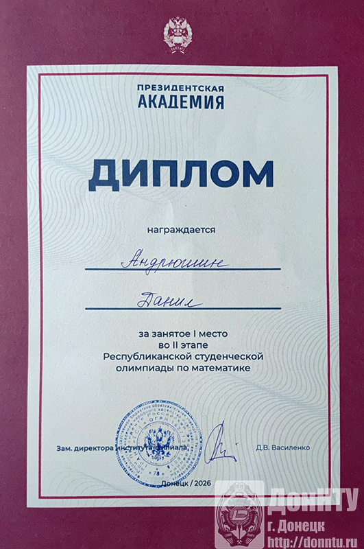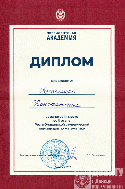 На базе Донецкого института управления – филиала Российской академии народного хозяйства и государственной службы при Президенте Российской Федерации 25 марта прошёл II этап Республиканской студенческой олимпиады по математике, на которой студенты ДонНТУ стали победителями и призёрами: