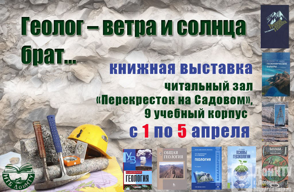 ко Дню геолога ознакомиться с книжной выставкой «Геолог – ветра и солнца брат!..» (читальный зал «Перекресток на Садовом», 9 учебный корпус, с 1 по 5 апреля);
