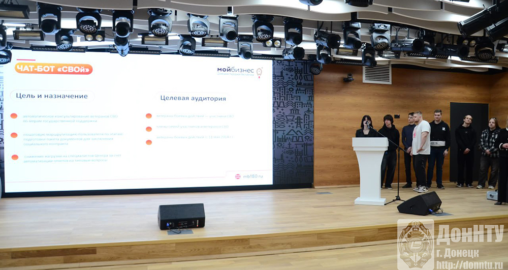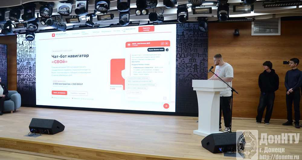 На мероприятии был презентован чат-бот «Свой», который разработали студенты ДонНТУ. Программное решение было создано ими в рамках хакатона, организованного республиканским Центром , и .