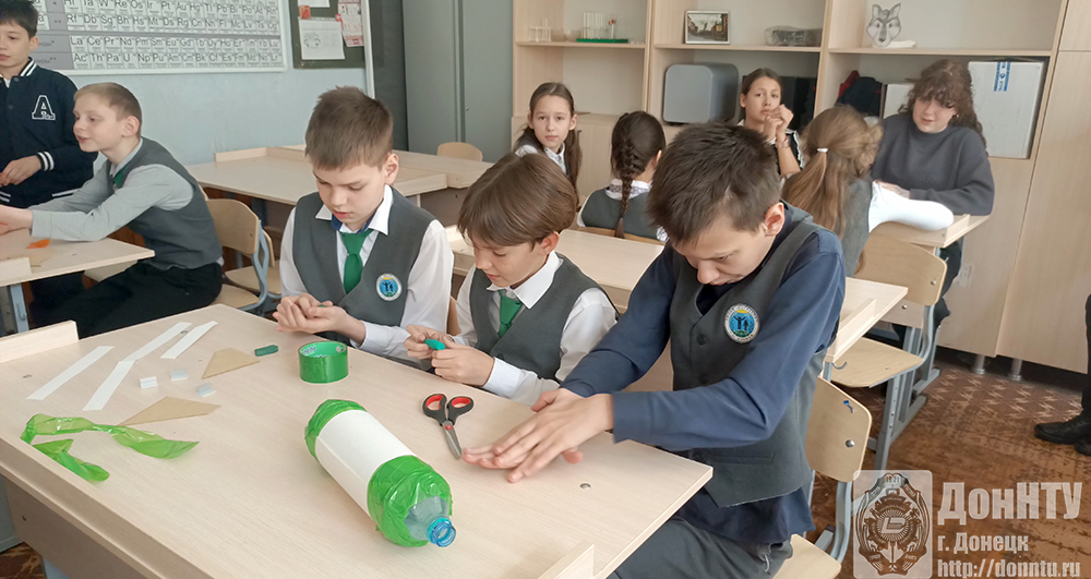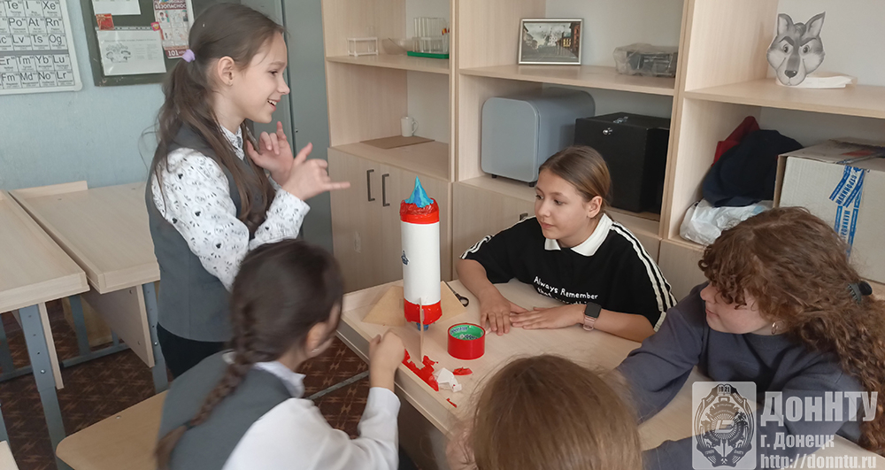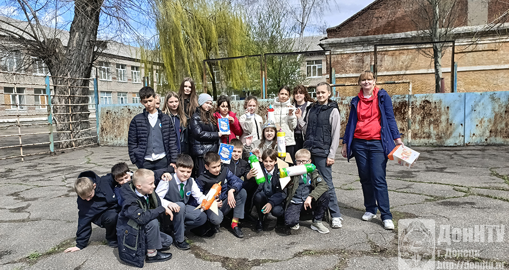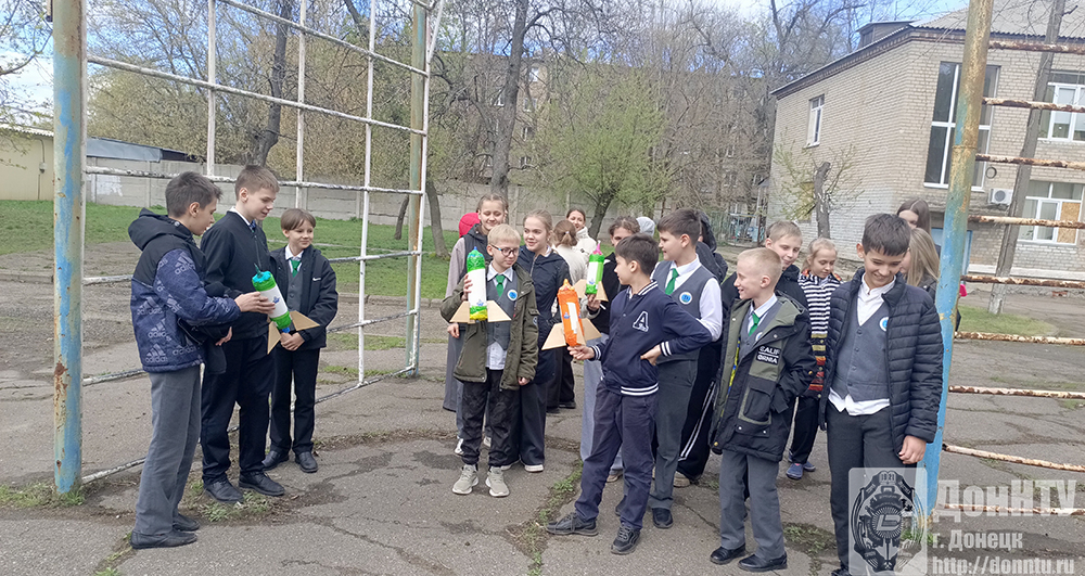 В донецком лицее «Интеллект», который курирует ДонНТУ, 7 апреля ученики 5 и 6 классов впервые попробовали построить прототип пневматической ракеты. Шесть команд соревновались между собой, кто сделает ракету быстрее, более точно установит на ней стабилизаторы. И ракета какой команды взлетит выше и дальше!