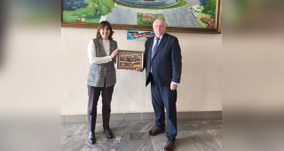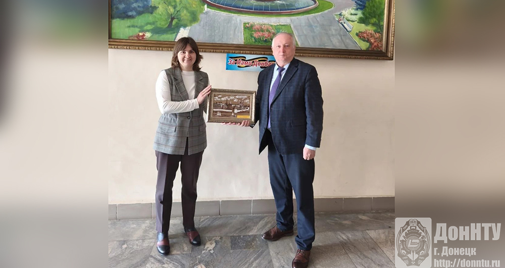 А. С. Сергиенко с просьбой передать ректору ДонНТУ А. Я. Аноприенко подарок – памятную картину, которую руководитель стажёров ФИЭР вручила ректору Донецкого политеха 14 апреля.