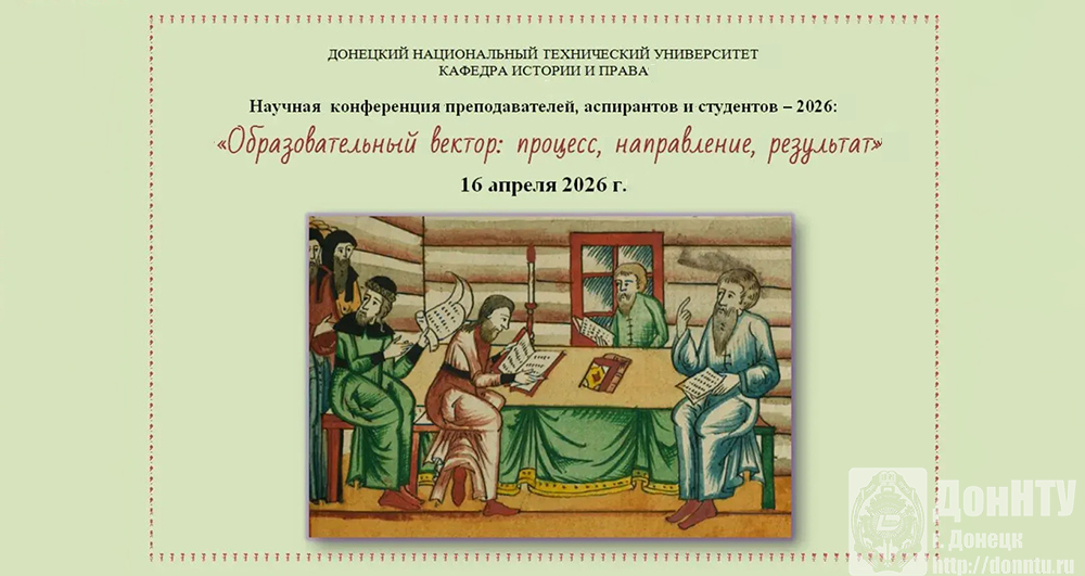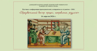 16-17 апреля в дистанционном и очном форматах состоялась ежегодная конференция преподавателей, аспирантов и студентов «Образовательный вектор: процесс, направление, результат», организованная кафедрой истории и права. В оргкомитет поступили работы от студентов и преподавателей ДонНТУ, Донбасского государственного университета юстиции Минюста России, Донецкой государственной музыкальной академии им. С. С. Прокофьева, Севастопольского государственного университета.