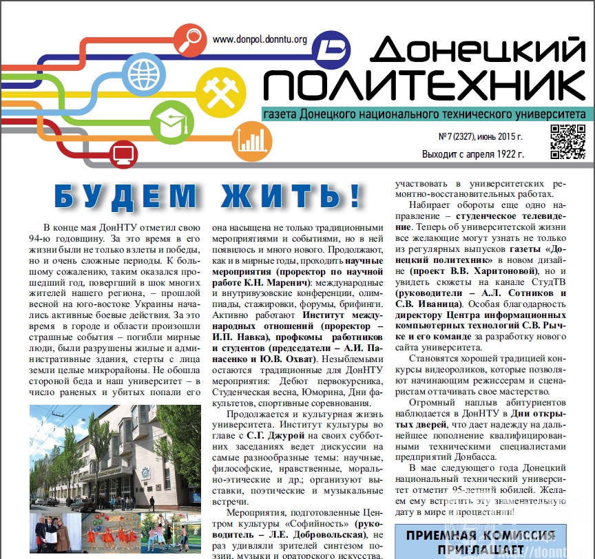 В конце мая ДонНТУ отметил свою 94-ю годовщину. За это время в его жизни были не только взлеты и победы, но и очень сложные периоды. К большому сожалению, таким оказался прошедший год, повергший в шок многих жителей нашего региона, – прошлой весной на юго-востоке Украины начались активные боевые действия. За это время в городе и области произошли страшные события – погибли мирные люди, были разрушены жилые и административные здания, стерты с лица земли целые микрорайоны.