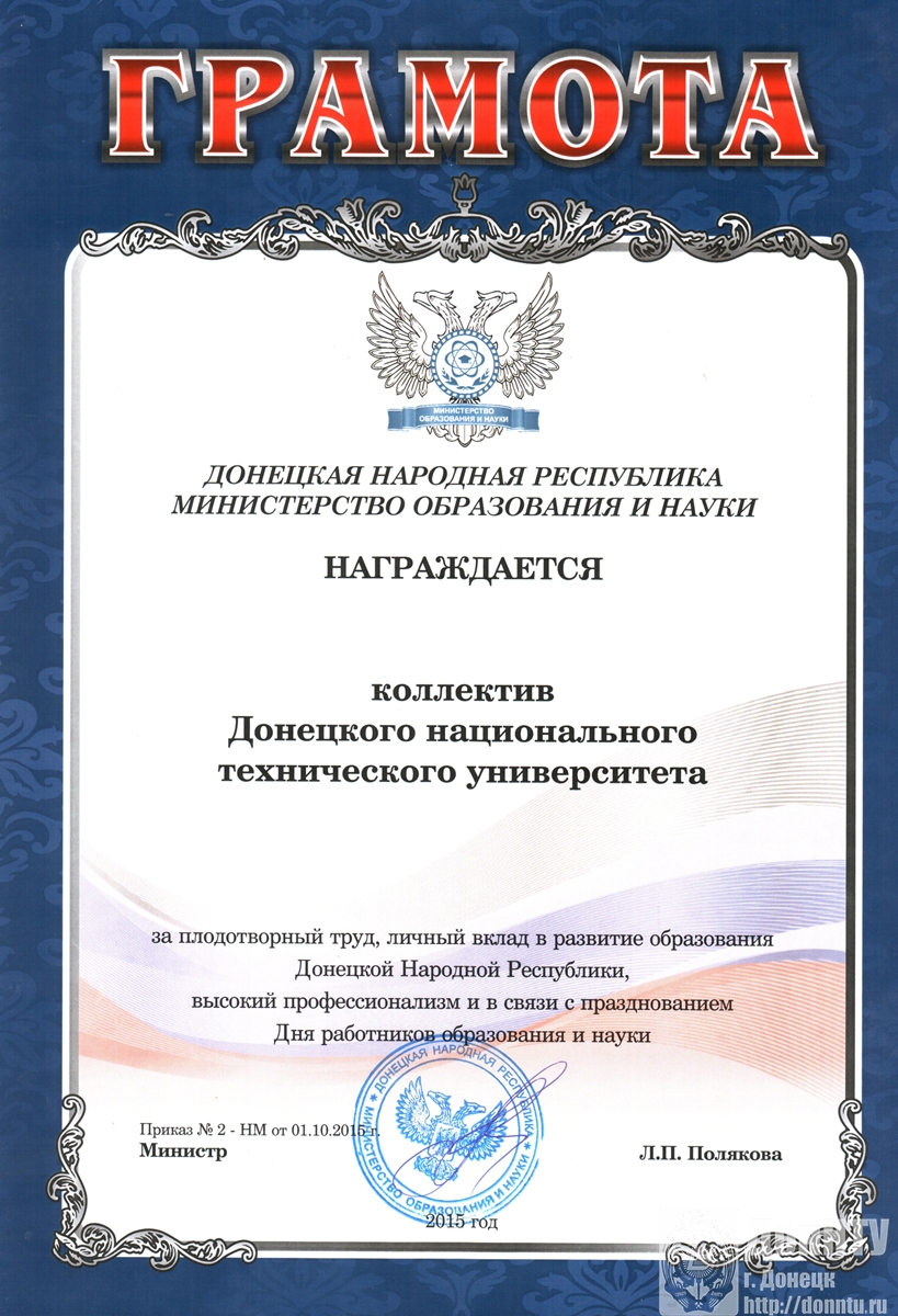 На Совете развития Донецкого национального технического университета (ДонНТУ) 06 октября 2015 года Министр образования и науки Донецкой Народной Республики Лариса Петровна Полякова вручила коллективу ДонНТУ почетную грамоту за плодотворный труд, личный вклад в развитие образования Донецкой Народной Республики, высокий профессионализм и в связи с празднованием Дня работников образования и науки.